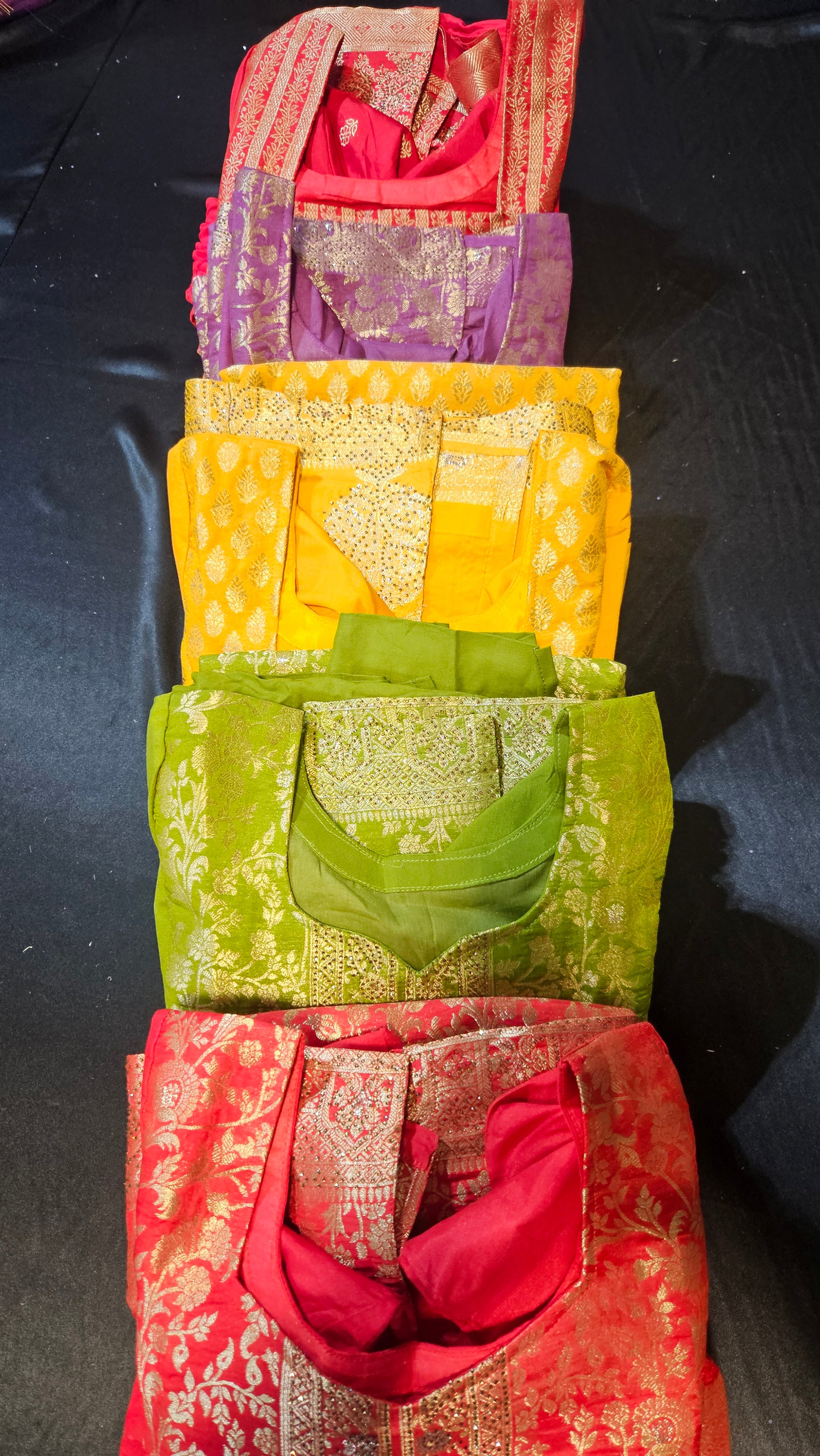 Elevate your wardrobe with this show-stopping Red and gold suit set that's ready to turn heads! Crafted from luxurious banarasi silk adorned with shimmering golden zari embroidery, the top pairs beautifully with soft rayon palazzo pants and a matching golden jari duppatta.