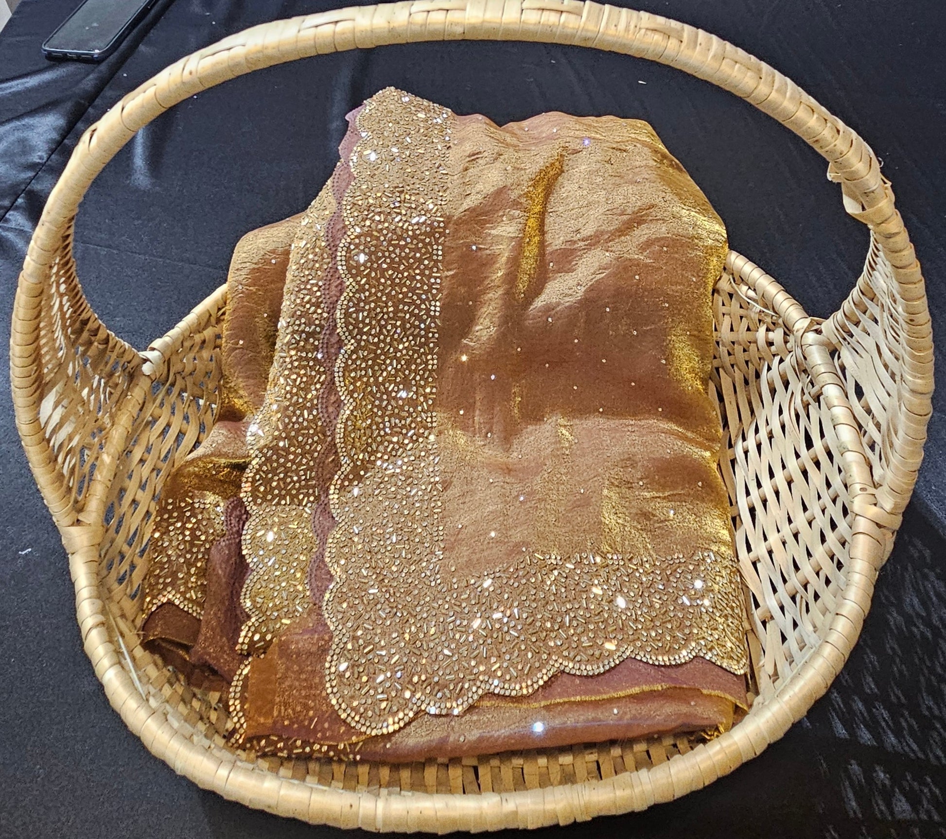 Dive into elegance with this show-stopping light orange saree that's anything but ordinary! Crafted from luxurious crushed space silk, it's adorned with shimmering golden cut beads and stones scattered across every inch for maximum sparkle.